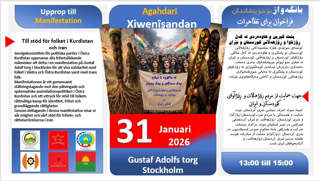 کۆمیتەی سوئێدی هێزە سیاسییەکانی ڕۆژهەڵاتی کوردستان بۆ پشتگیری و هاودەردی لەگەڵ خەڵکی ڕۆژئاوای کوردستان و ڕۆژهەڵاتی کوردستان و ئێران لە شاری ستۆکهۆڵم خۆپێشاندانێک وەڕێ دەخات.